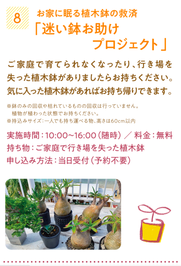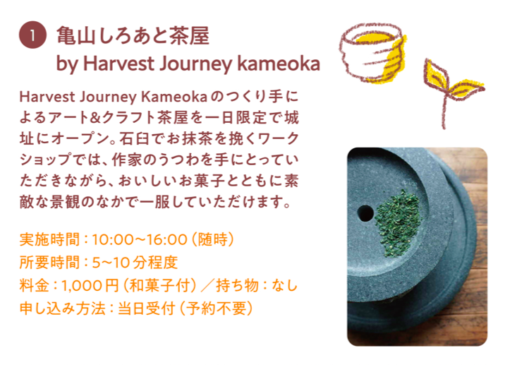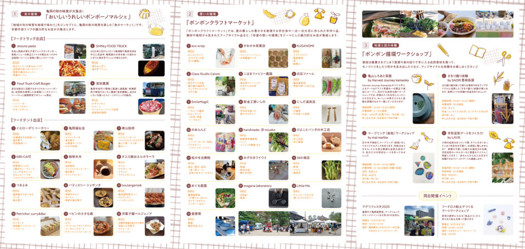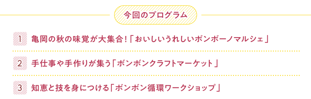 さらには、秋の亀岡の味覚が集う「ボンボーノマルシェ」、手仕事&手作り品に出会える「ボンボンクラフトマーケット」、植木鉢の救済、不要品の持ち寄り&交換会など、魅力的な企画が目白押しです!