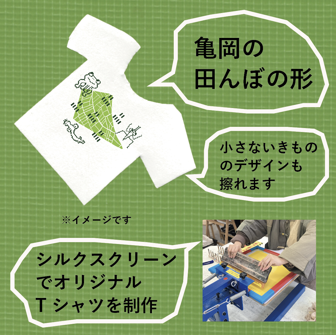 そして、亀岡の田んぼの形をシルクスクリーンで自分のTシャツに刷ってみませんか?