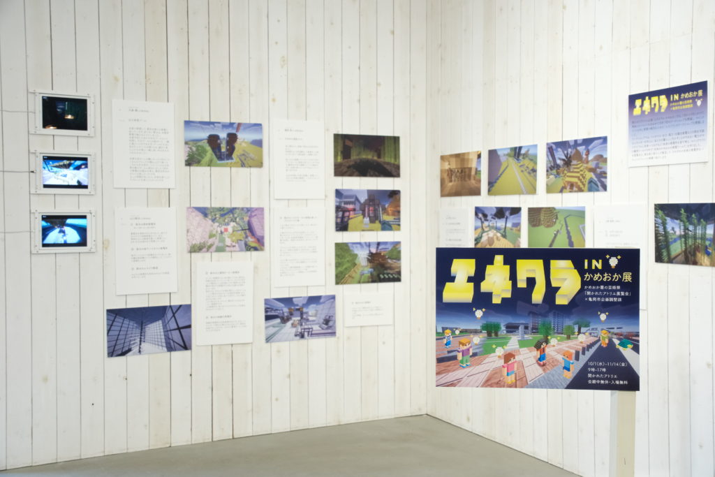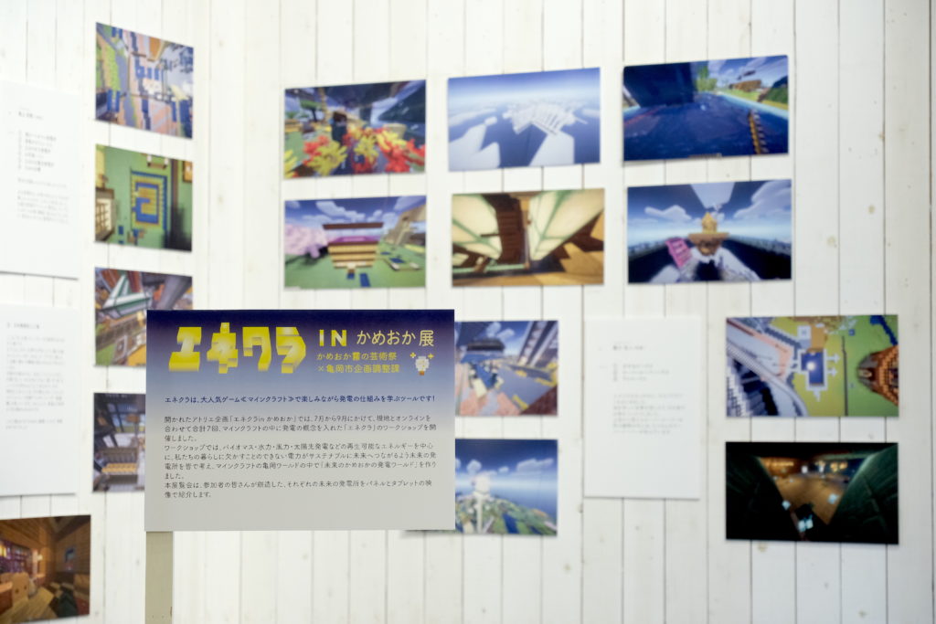 開かれたアトリエ展企画「エネクラinかめおか」は、マインクラフトに発電の要素を取り入れた「エネクラ」(エネルギー×マイクラ)で、バイオマス・水力・風力・太陽光発電などの再生可能なエネルギーによる発電を学び、未来の亀岡の街を創造していくワークショップを、7月から9月にかけて合計7回開催しました。