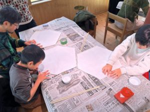 今回は亀岡の亀の亀甲模様にちなんで「六角凧」に挑戦。