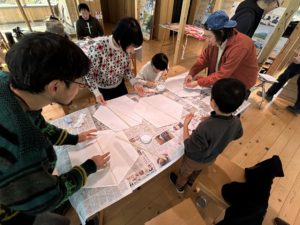 また、その意味や特徴の話を聞きました。それぞれ地域独自の形や文化が残ってきていることに感激しながら、亀岡の凧とはどんな形になるのか。作りながら考えることにしました。
