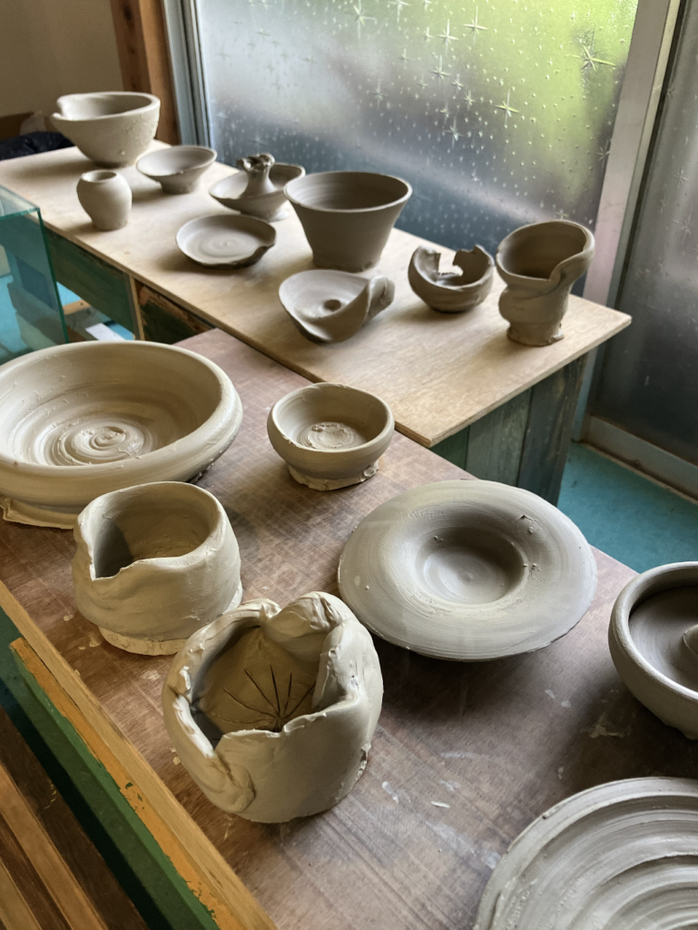 ぐるぐる回るろくろの上でぐにゃぐにゃと形をかえる粘土の感触の気持ちよさ、思ったとおりにならないむずかしさ、でも偶然かっこいいうつわになったりUFOになったり、ろくろはとっても楽しい! その楽しさを体験してほしくて、ろくろ回し放題の日をつくりました。