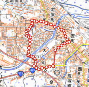 今回歩いたルート:亀岡市役所周辺(安町、河原町)