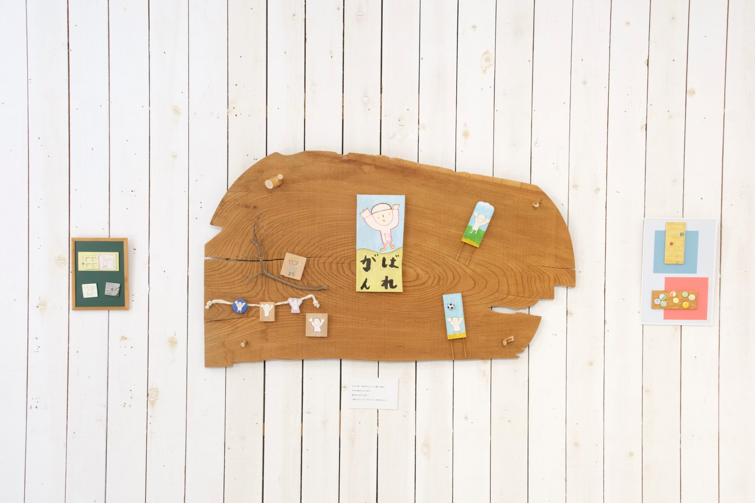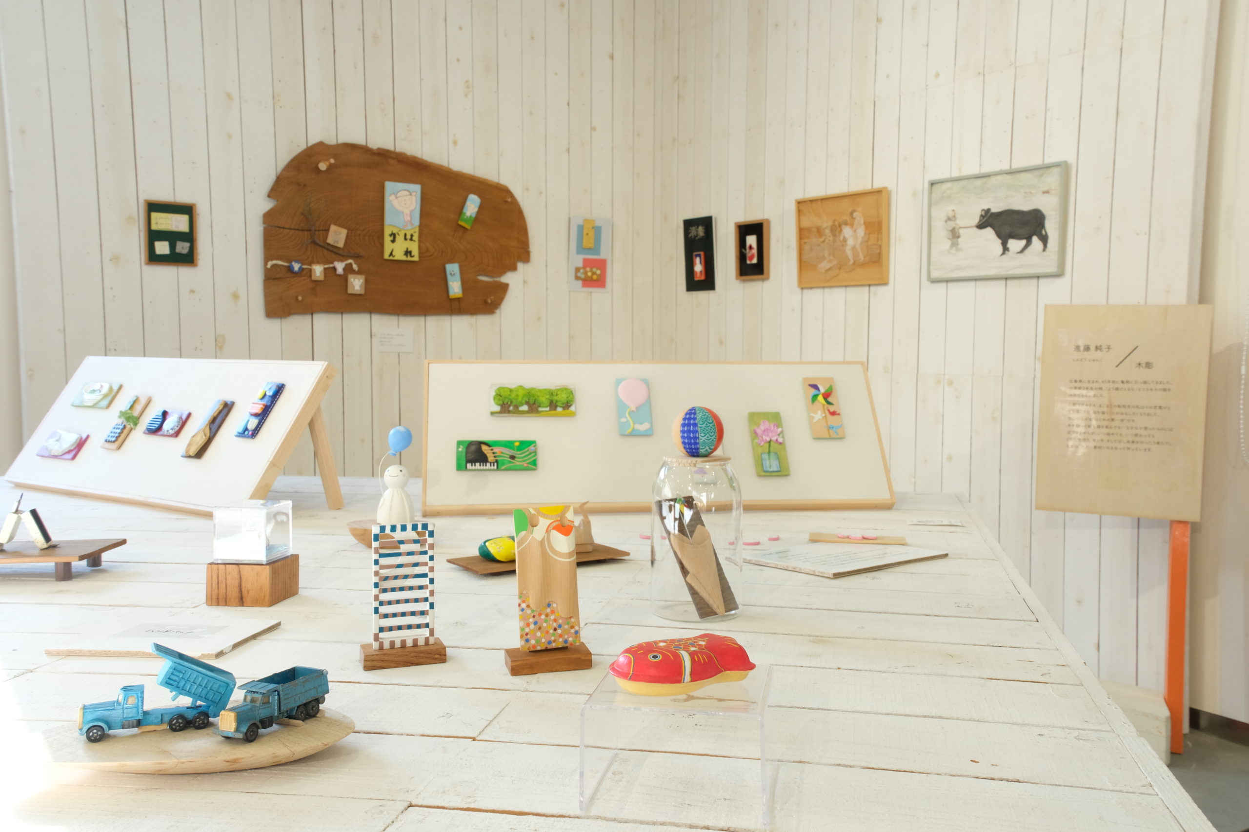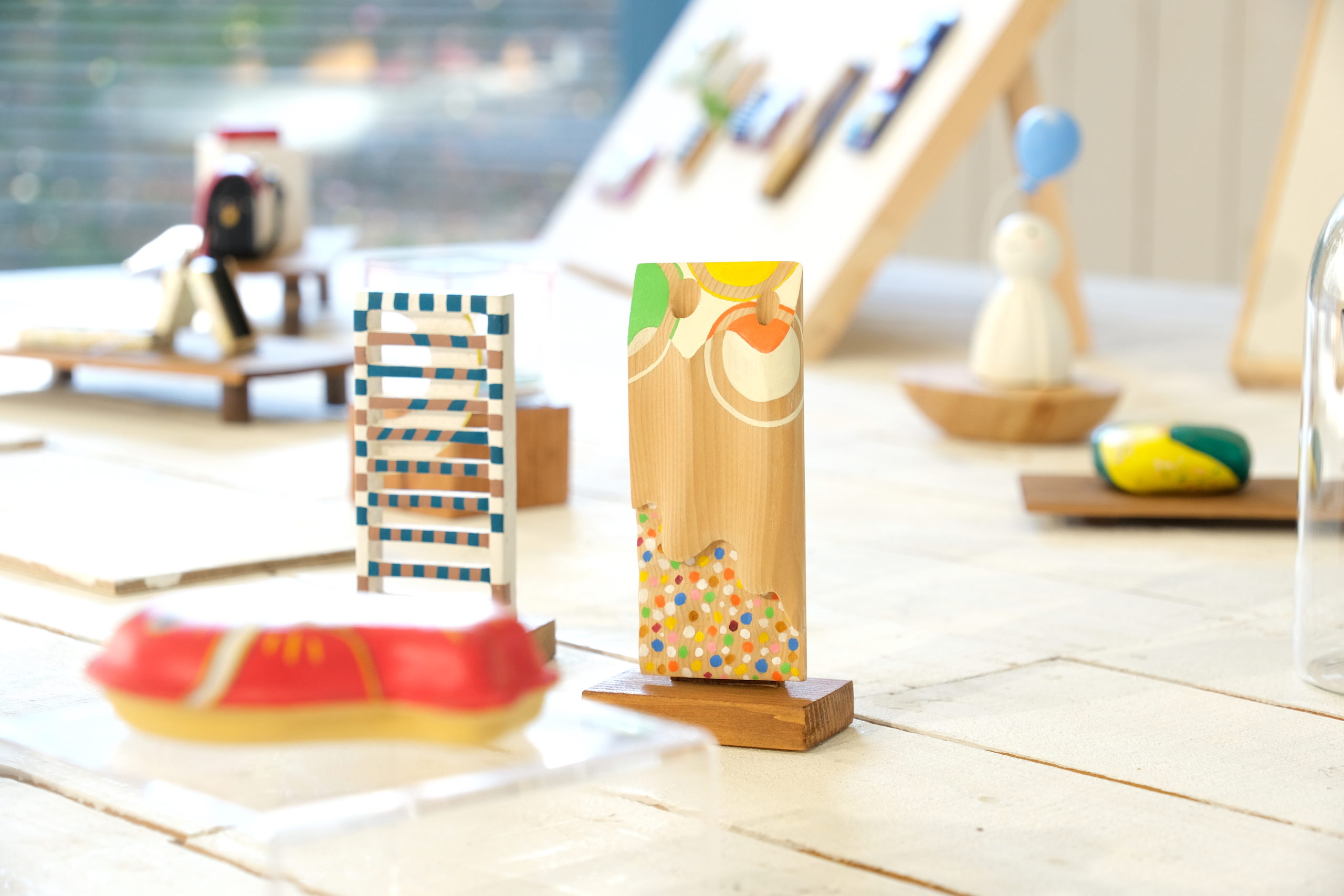 進藤さんの作品は、かまぼこ板や木の端材を素材に、「記憶の中の、大切な懐かしいもの」をテーマに制作されました。細部の模様までこだわり抜かれた作品群は、形が決まった身近な素材であるかまぼこ板が、楽しく愛らしい作品へと生まれ変わる様子に、来場者の多くが驚かれ、興味を持たれていました。