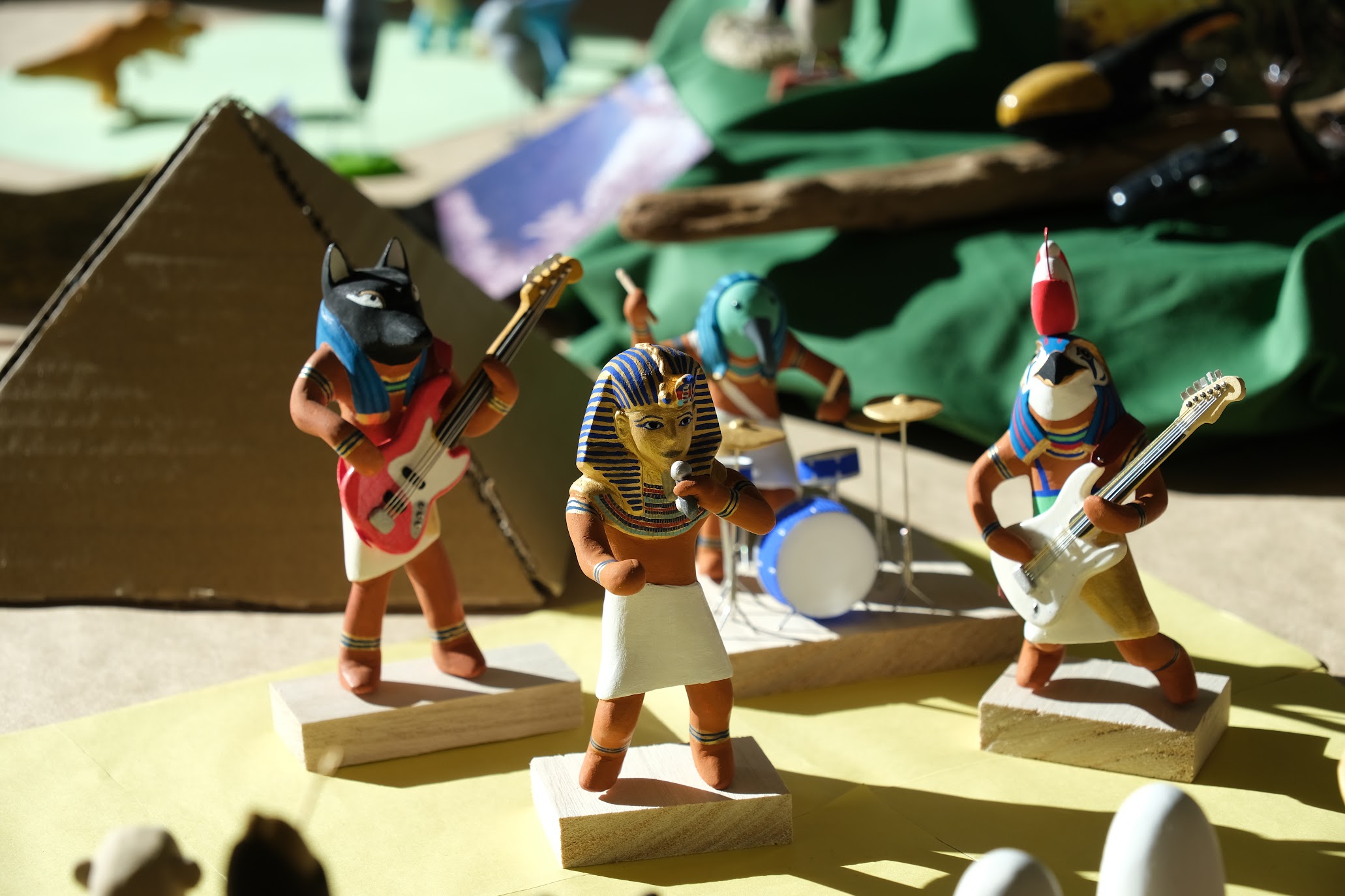 米井さんの作品は、大きなテーブルの上に山や海、里、そしてエジプトを舞台に、独特な目つきの動物たちや鳥たち、架空の生き物や、エジプトの神々モチーフにしており、そのどれもが個性的で、来場者の方々は時間をかけてじっくりと作品を鑑賞し、それぞれのお気に入りを見つけておられました。特に、楽器を持つ様々な動物たちや、少し生意気にも見える視線が印象的で、多くの人の目を引いていました。たくさんの作品の中には、「かめまる」も隠れており、かめまる探しを楽しむ方もいらっしゃいました。