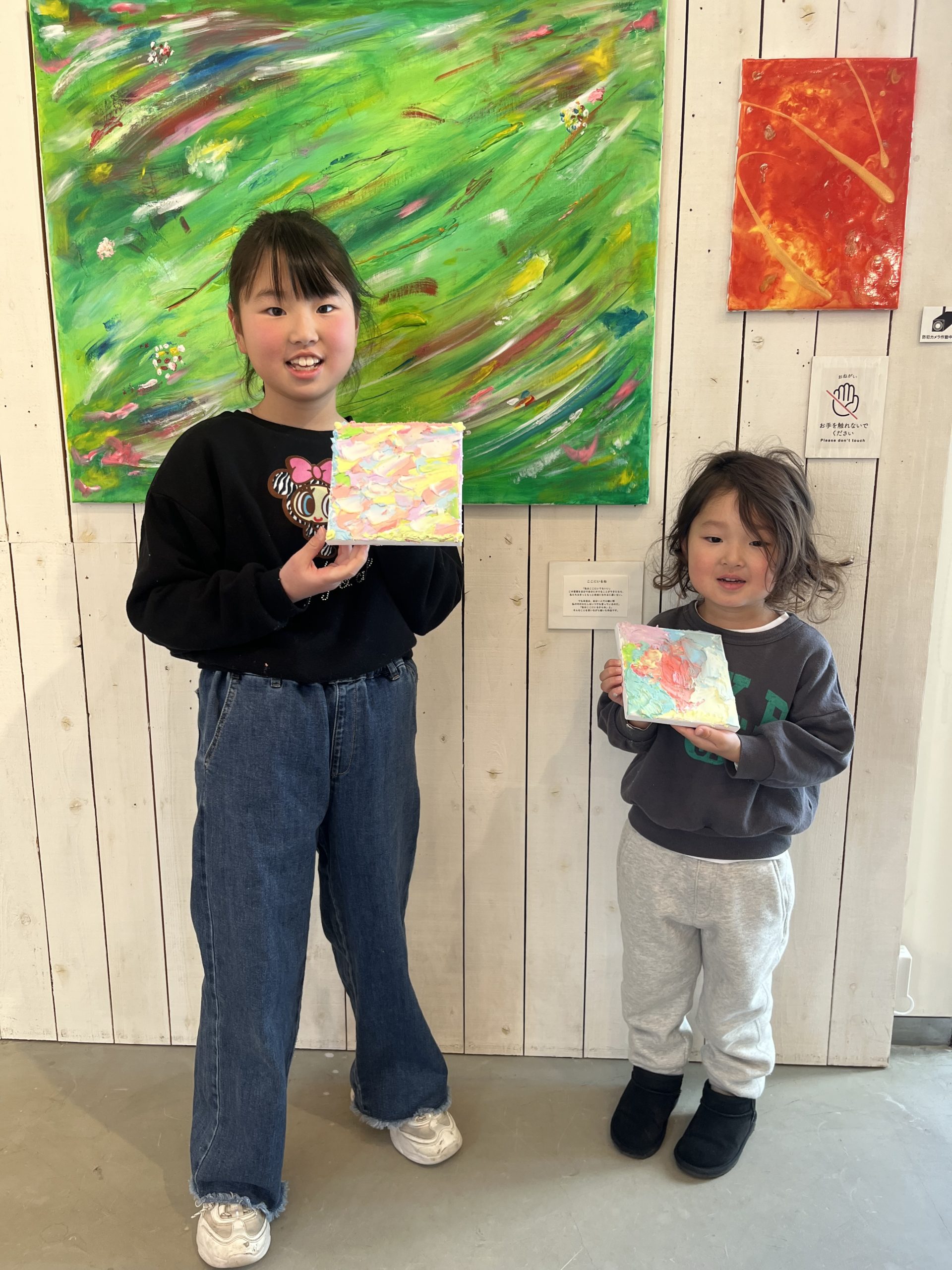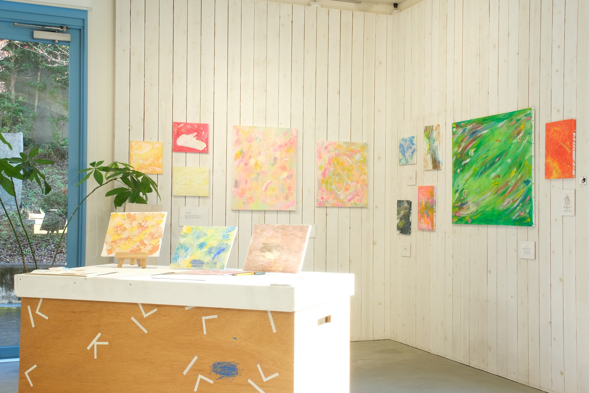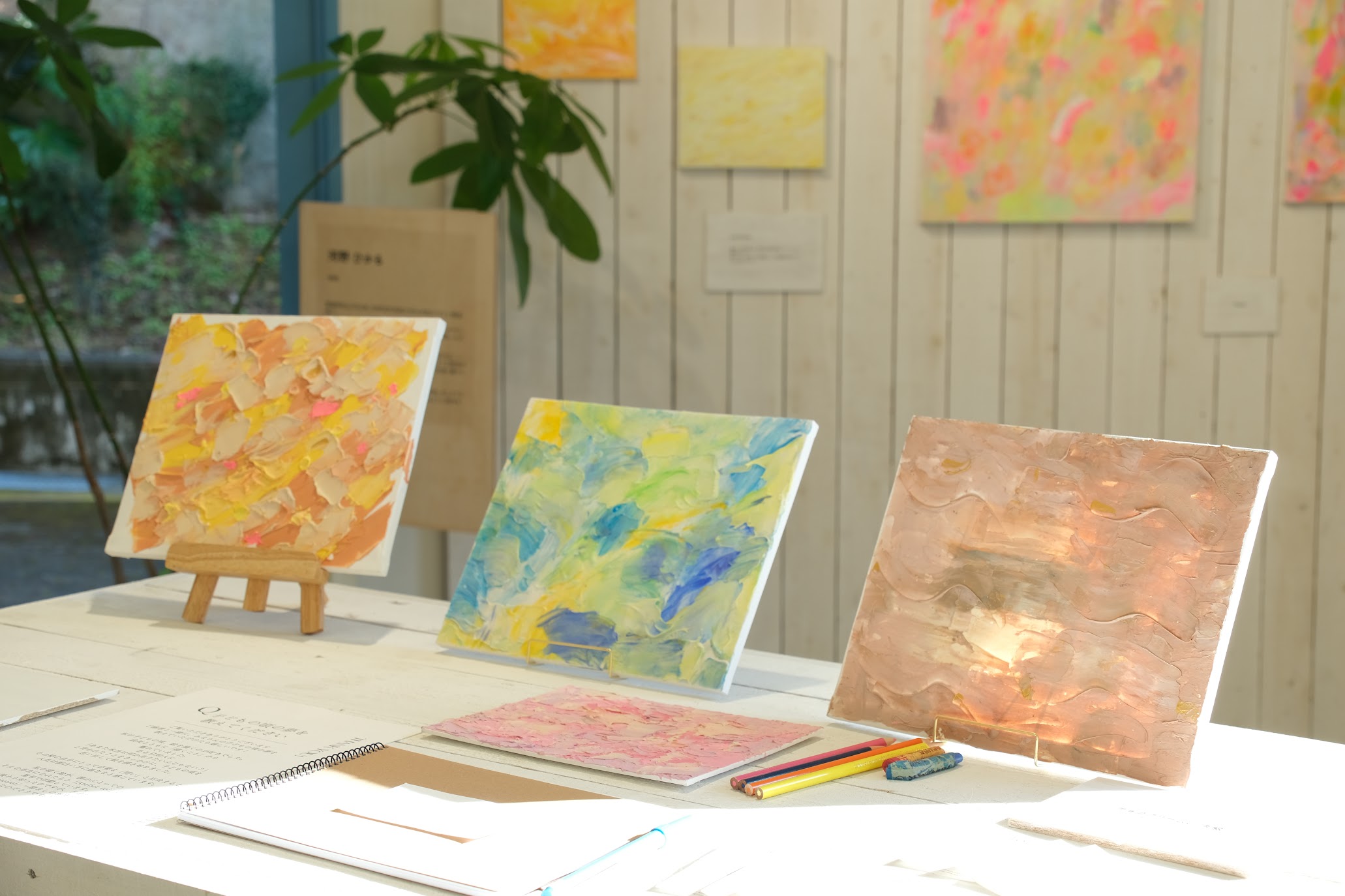 河野さんの抽象画は、アクリル絵の具と多様なメディウムを駆使し、様々な質感と光沢を生み出していました。来場者の方々は、作品の特徴的な明るく優しい色彩や質感をじっくりと眺めながら、それぞれの絵タイトルを思い描いていました。