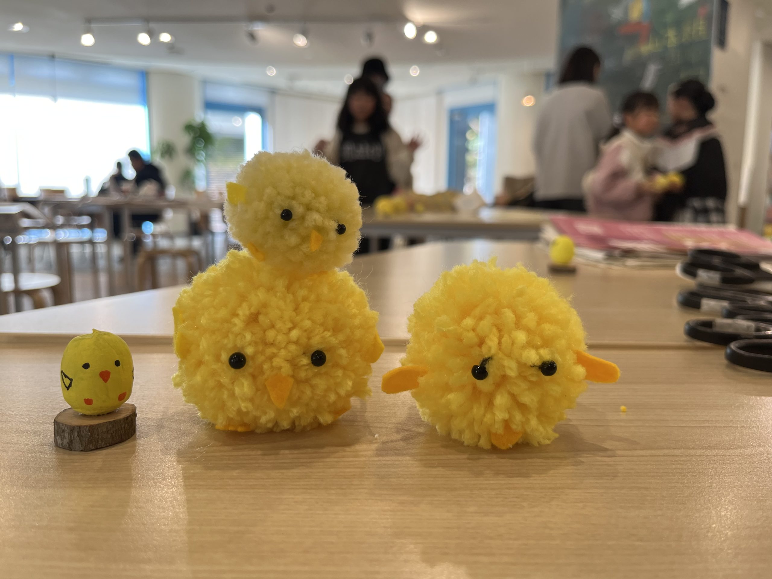 辻井さんの毛糸やどんぐりを使ったひよこのマスコット作りでは、大きさが2種類の毛糸のひよこと、どんぐりを使ったひよこを制作しました。同じ愛料と作り方でも、参加者の皆さんそれぞれのひよこの表情が個性的で、たくさんの可愛い作品が出来上がりました。
