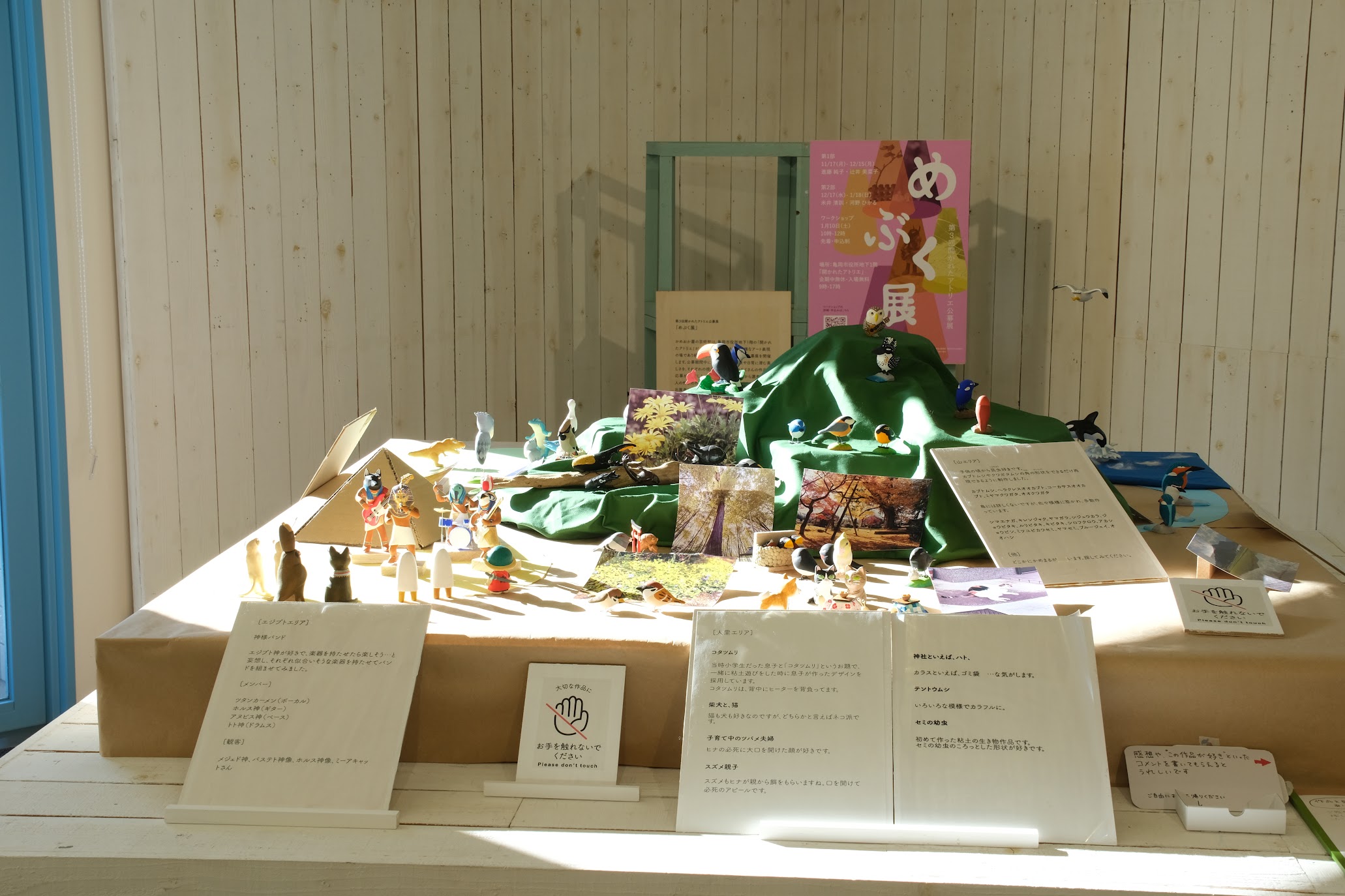 第1部(11月17日~12月15日)では、進藤純子さんの木彫作品と、辻井美菜子さんの写真と映像・手芸作品、第2部(12月17日~1月18日)には米井清訓さんの粘土細工の作品と、河野ひかるさんの絵画作品の展示をしました。