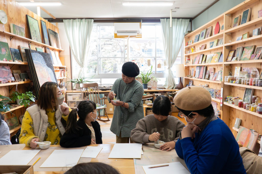日常生活の情景や経験をモチーフに制作している日本画家のベリーマキコ。その現場を垣間見るオープンアトリエを実施しました。作家より道具や作品の説明を聞きながら、アトリエを見学しました。石から絵の具を作り出す「ゴリゴリえのぐ」を作り、1人ずつ色紙に絵を描きました。最後は作家の手法として特徴的な「長い筆」も体験し、みんなでひとつの絵を作りました。