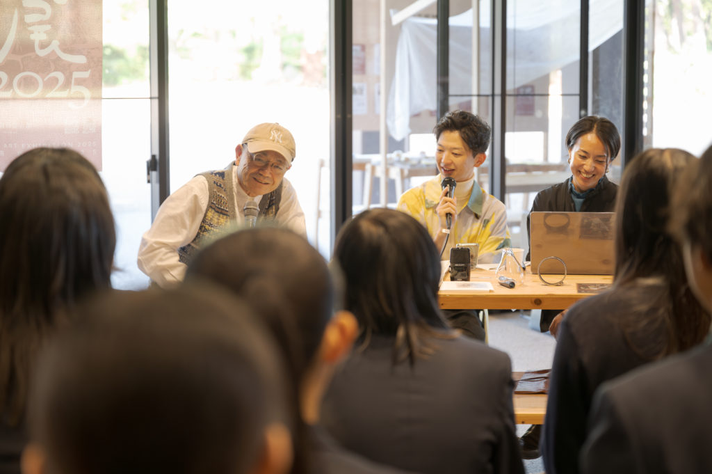 亀岡高校の卒業生である松岡さんと、市内にアトリエを構える森田さんが、高校生とともに「制作を続ける楽しさ」について語りました。さらにスペシャルゲストとして、松岡さんの恩師であり森田さんの大学の先輩でもある彫刻家の中ハシ克シゲさんが参加し、作家・学生・教員という垣根を超え、作家としての生き方や美術が持つ面白さを分かち合いました。