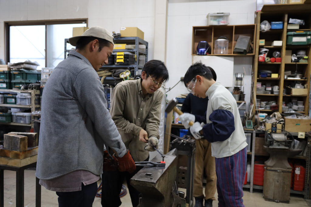 彫刻家・森田舞さん、山本学司さんのアトリエ「MUKU ART BASE」を訪問し、彫刻制作や立体作品の保存修復事業、さらには「あったらいいな」を形にする〈mogana laboratory〉などの制作現場を見学しました。ワークショップでは、鉄を真っ赤に熱してハンマーで叩き、硬い鉄が熱と参加者自身の手とハンマーによって変化していく様子を体験しました。