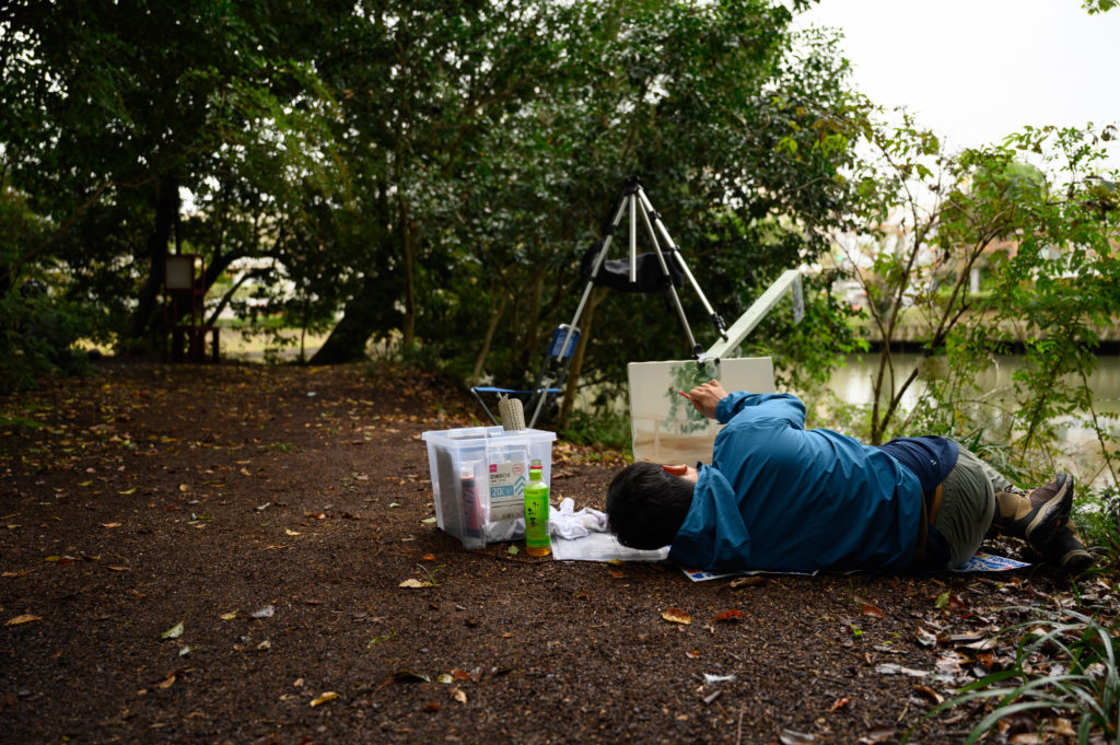 あいにくの雨天により予定していたワークショップは中止となりましたが、代わって作家によるライブパフォーマンスが実施されました。木材を組み合わせて自作した道具や三脚などの身の回りのものを即興的に構成し、屋外で体勢を変えながら風景画を描き上げていました。
