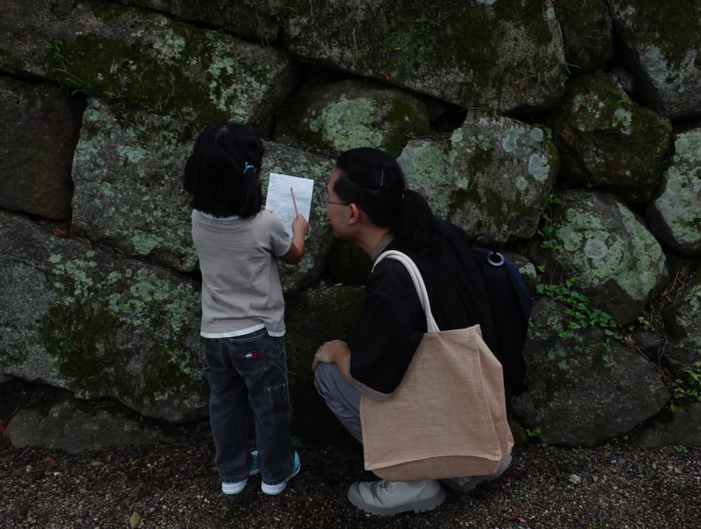 亀岡城下町の石リサーチとハンコ作りワークショップを開催しました。亀山城跡の石垣の歴史を学んだあと、亀山城跡周辺のまちを歩き、石・石垣を拓本や写真などで記録し、石を模したハンコを彫りました。WSで作成したハンコは城跡芸術展の出品作品に展示しました。