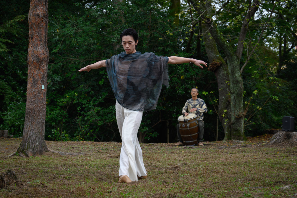 松林にて、南江祐生によるパフォーマンスが上演されました。松に吹く風を魂の鼓動に重ね、静中に動を聴き、動中に静を舞う。「松風の鼓動」という言葉のように自然と人の交歓に湧き上がる喜びの中で、でぐちみつぎのバレル(Barril de Bomba)が響き、舞台には生命の鼓動が吹き込まれました。