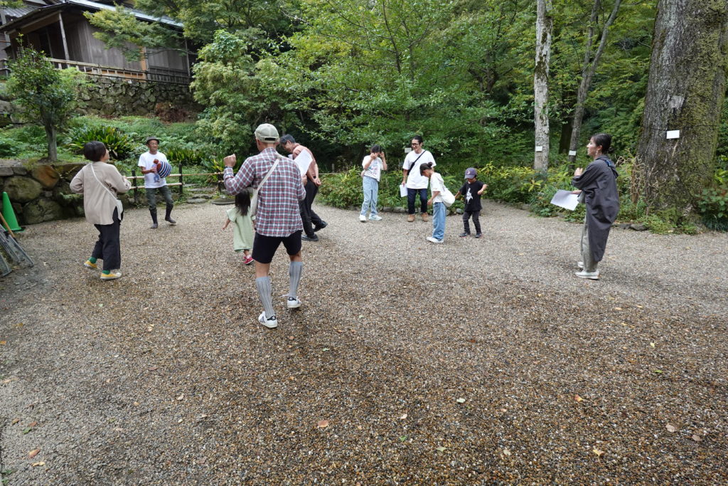 参加者はかめやま植物園の玉砂利の上で手足を動かし、広がる感覚世界の入り口を体験しました。道具を使って地面をならす、足音を立てずに歩く。普段無意識で行っている動作に目を向ける機会となりました。最後は植物園の玉砂利で栽培されているカワラケツメイを浜茶としていただきました。