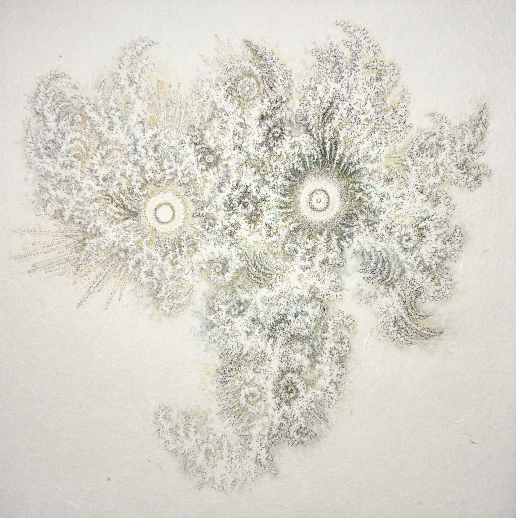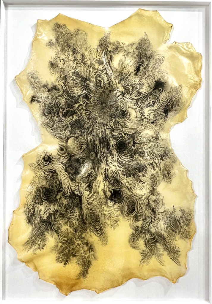 1994年亀岡市生まれ。描くことを自己が世界を獲得する行為とし、日本の風土から生まれた絵画の再考・創作を志向している。近年、祖母の死や入院中に見た雲の生成と消滅、医療に消費される豚を自覚し、豚生革や和紙に墨で点描した《はじまりもおわりもない》シリーズなどを制作。主な展覧会に「京都日本画新展2023」奨励賞・京都市長賞、「第9回トリエンナーレ豊橋星野眞吾賞展−明日の日本画を求めて−」審査員推奨など。現在、京都芸術大学書画コース非常勤講師。